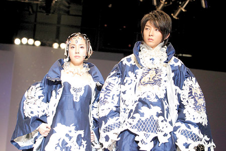 李俊基和韓志敏同臺登場,演繹國王和王后的形象。藍白兩色的運用可能是借鑒了中國的藍印花布。李俊基脖子邊綴滿的蕾絲花邊和韓志敏的低胸設計運用了西方元素。既然是從電視劇中得到的靈感,這樣的禮服自然而然就可以被稱為概念服