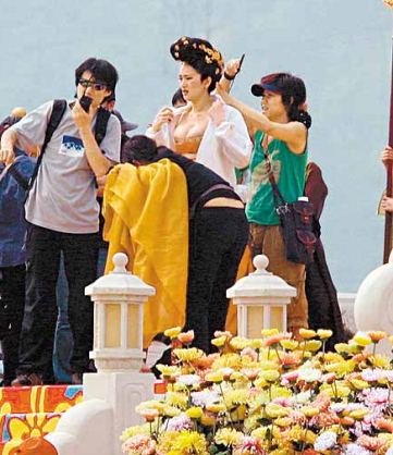 鞏俐在下午2時30分先在名清宮苑彩排,她所穿的唐朝皇后服非常性感,設計很低胸,鞏俐穿上后,豐滿而白皙的36E豪乳幾乎盡現人前,當她走動時,其胸部晃動得厲害,而伴隨她身后的宮女,同樣穿上低胸服露出乳溝,大賣性感,令現場男士大嘆驚艷,的確是最高境界的消暑良方!