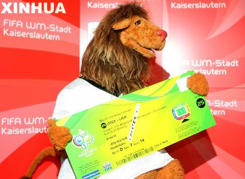環球在線消息:3月1日,德國世界杯吉祥物獅子Goleo VI在展示一張放大版的世界杯門票。當日,2006年德國世界杯足球賽門票在凱澤斯勞滕首次亮相。據介紹,本屆世界杯門票運用了高科技的激光防偽技術制作,并且有觀眾個人資料的詳細記載,很難偽造。