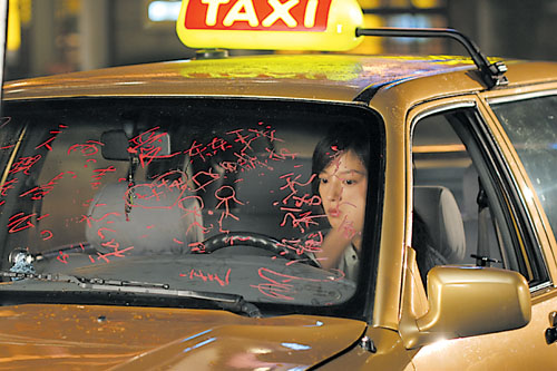 只見趙薇替身開著那輛用口紅寫滿“東東+我”、“好朋友”“戀人”、“二人現在分了”等字跡的出租車猛地撞向路旁的電線桿,本木被嚇壞了,疾步跑上去使勁敲打著車窗用日文大叫:你瘋了嗎?你不想活了!怎么可以去撞車!趙薇則一臉輕松的走下車來,用抹布將口紅字跡擦干凈。在給郭品超打了電話說要去修車后,心情大好的趙薇轉過身輕輕地拍了拍本木的臉頰,本木則像泄氣的皮球似的一下癱倒。