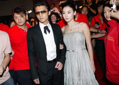 當(dāng)張柏芝挽著謝霆鋒的手臂一起走入內(nèi)場時(shí),所有香港記者全撲到“金童玉女”面前拍照,搞得張柏芝花容失色。
