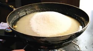 把白砂糖倒入鍋中,按糖與水2:1的比例加入水,用猛火熬20分鐘左右。糖熬到剛剛好時,呈黏稠的透明狀。如果熬制時間不夠,糖會粘牙;如果熬得過久,糖則會泛苦味。