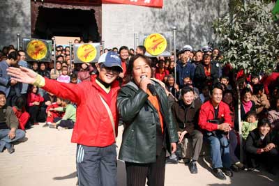 面對央視的攝像鏡頭,最讓劇組擔(dān)心的就是參賽的農(nóng)民兄弟放不開而造成冷場。不過,現(xiàn)場狀況完全出乎工作人員意料之外。經(jīng)過短暫的明星熱場演唱之后,農(nóng)民秀比賽開始了。先是一個小伙子登場亮相,嘹亮的嗓音、半專業(yè)的身段一看就知道平時在k歌場練過。隨后,年齡大小不一性別男女不同的選手輪番出場,除了個別選手有些緊張之外,大多數(shù)人都是輕松自如落落大方,顯示了西北農(nóng)民的豪爽性格。最有意思的是,中午劇組吃飯的房東家大嫂也出場獻上一曲高難度的《青藏高原》。盡管不是很專業(yè),但是聽起來很過癮。因為選手太多,評委規(guī)定只演唱一段,可是規(guī)定時間唱完之后,大嫂說:“還有一段,讓我唱完嘛!”然后接著唱,逗得大家前仰后合。一曲歌畢,導(dǎo)演孟欣走過去想接過話筒,可是這位大嫂又發(fā)話了:“你們電視臺輕易也不來一次,讓我過過癮嘛。我剛才有句話忘詞了,下面我再唱一個!币话淹崎_孟欣接著唱。這時,孟欣才意識到自己遇到了樸實可愛的農(nóng)民“麥霸”。大嫂的熱情和豪氣瞬間感染了全場,一連四首歌都把選秀變了自己的個唱。