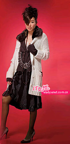 白色長款針織開衫搭配茶色套裙,強調表現優雅形象