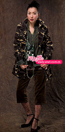 迷彩寬松外套搭配深棕色7分絨褲,個性而不張揚