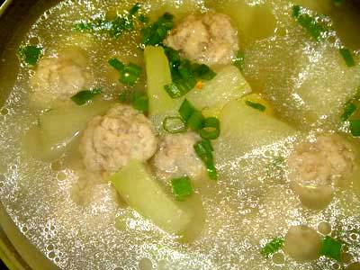 煲湯原料:冬瓜500克,五花肉250克,蔥10克,生粉少許,鹽、味精適量