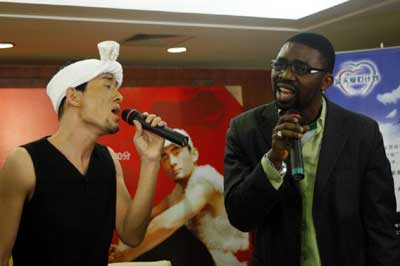 圖為:在昨天的發(fā)布會(huì)上,阿寶和郝歌現(xiàn)場(chǎng)飆歌。