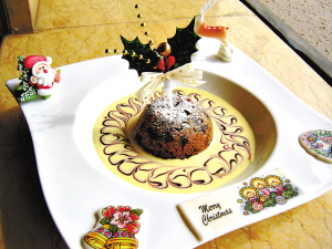 節日布甸是傳統的甜點,里面有提子干、各色果皮等,是蒸過以后再焗的。配的是白蘭地汁,這是這款節日點心的固定搭配。