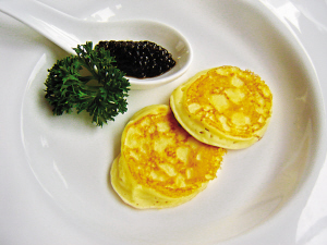 這道開胃菜是很傳統的俄羅斯風格,但魚子醬卻是來自黑龍江,花園酒店大廚說它很新鮮,味道也毫不遜色。魚子醬鮮滑爽口,不需要任何加工就可以直接食用,原汁原味。蕎麥薄烤餅是兩個小小的圓餅子,剛好可以盛下魚子醬,頗為精致。