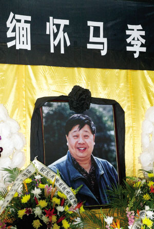 靈堂處于三樓排練廳,在樓梯兩旁擺滿了前一天姜昆從花鄉訂來的盆花。會場內,悼念馬老的花圈、挽聯擺了一屋子,是各省市曲藝團、相聲學會,以及國外曲藝界人士送來的。廳內正中央掛著馬老的遺像,是他上世紀80年代末在威海演出時的留影。馬老的徒弟們在遺像右側站成一排,負責接待。姜昆、趙炎、馮鞏、劉偉、笑林等泣不成聲,看遺像的眼神就像孩子看自己的父親。“我們將24小時輪流在這里守靈,讓師傅安穩地走。”馮鞏擦著眼淚說。