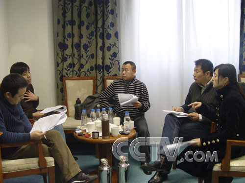 記者先是在劇組工作人員的幫助下,打聽了金越導(dǎo)演的工作地方,原來金越導(dǎo)演正在和小品演員討論小品本子的事情,雖然語言類終審已經(jīng)結(jié)束,但并不意味著小品相聲類節(jié)目的最終定型,在搬上2007年春晚直播舞臺(tái)之前,還有很長(zhǎng)的路要走,那就是一次次的修改,一次次的完善,力求達(dá)到最好的演出效果。