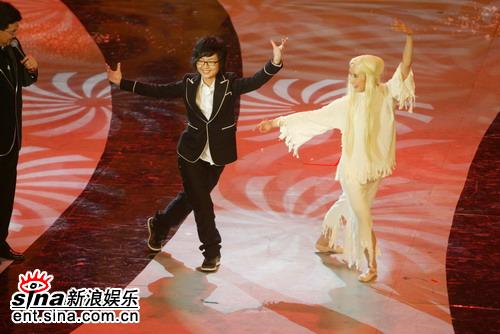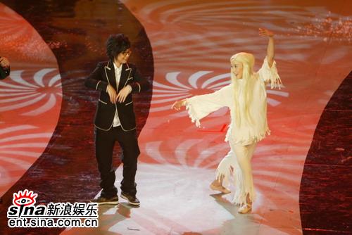 周筆暢演唱《白毛女》時,舞池中翩翩起舞的“喜兒”是2006年《舞林大會》季軍胡靜。表演結(jié)束后,兩人一同登臺串場,周筆暢羨慕胡靜舞技精湛的同時,不慎露出口風:“我小時候也學(xué)過芭蕾!贝搜砸怀,筆迷陷入瘋狂,尖叫著要求偶像來一段?蓯鄣墓P筆吐舌嘟噥了聲“早知道我不說出來了”,還是乖乖跟著胡靜表演了幾個芭蕾基本手位,雖然不是特別熟練,倒也有板有眼,讓筆迷尖叫連連。主持人問她是否有意參加今年的《舞林大會》,筆筆老老實實地說:“我有想過啊,就是一直沒想好到時候該穿什么服裝!惫P迷則興奮地大叫:“筆筆!國標!恰恰!”