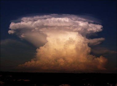 這個傍晚拍攝的云朵照片似乎很容易讓人聯想起核爆炸形成的“蘑菇云”景觀。不過請不用擔心,這個云朵里有的只是水蒸氣和空氣塵埃,并沒有“蘑菇云”里散發出的放射性物質。
