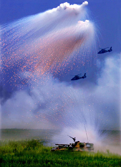 一場毫無征兆的大雨,遮蔽了豫西南演兵場。望遠鏡中,強擊機、直升機射出的導彈和榴彈炮、火箭炮發射的炮彈交織在一起,在雨中原野形成一片恐怖的死亡地帶。