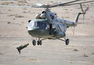 資料圖:7月12日,即將出國參加“和平使命—2007”上海合作組織成員國武裝力量聯(lián)合反恐軍事演習(xí)的中方參戰(zhàn)部隊(duì)特種作戰(zhàn)隊(duì)員在進(jìn)行快速滑降訓(xùn)練。