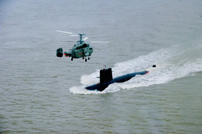 資料圖:東海艦隊卡-28艦載直升機與宋級潛艇協同演練