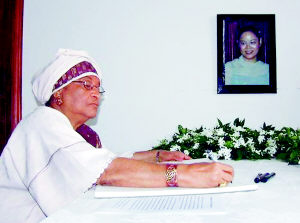 瑟利夫總統在吊唁簿上留言。我駐利比里亞大使館供圖