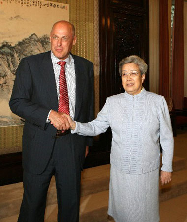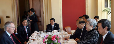 5月24日,中國(guó)國(guó)務(wù)院副總理吳儀在華盛頓會(huì)見美國(guó)國(guó)會(huì)參議院多數(shù)黨領(lǐng)袖里德等美國(guó)參議員。 新華社記者 饒愛民 攝