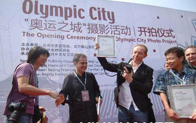 2007年5月10日,法國攝影師吉爾斯·薩布里埃(左三)在展示頒發給他的證書。當日,“奧運之城”攝影活動在北京金融街開拍,來自美國、西班牙、法國、日本、德國和馬來西亞6個國家的10位外籍攝影師接受邀請,他們將在一周的時間里,用自己的鏡頭全方位、多角度去發現和捕捉奧運籌備之年北京的特色和活力。新華社記者羅曉光攝