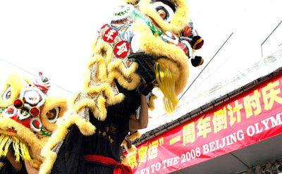 8月8日,澳大利亞第二大城市墨爾本的華人舉行活動(dòng),慶祝北京2008年奧運(yùn)會(huì)倒計(jì)時(shí)一周年。圖為慶祝活動(dòng)上的舞獅表演。新華社記者唐迎攝