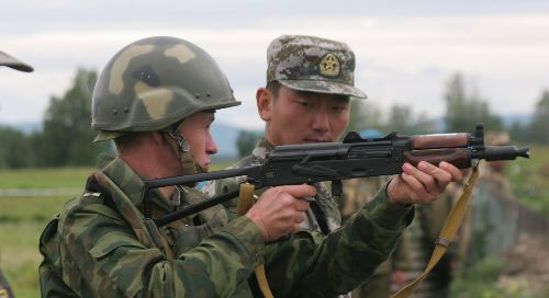 “和平使命-2007”聯合反恐軍事演習正在俄羅斯車里雅賓斯克州舉行。在烏拉爾軍區某訓練場,六國的軍人舉辦了一次軍事交流活動。圖為俄羅斯士兵與中國軍人交流射擊體會。