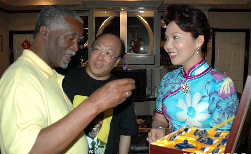 資料圖片:2006年2月17日,在南非約翰內斯堡東南300多公里的紐卡斯爾,南非總統姆貝基(左)在南非華人國會議員黃士豪(中)家里做客,鼓勵南非華人參政議政,投身南非的經濟建設。新華社記者陳銘攝