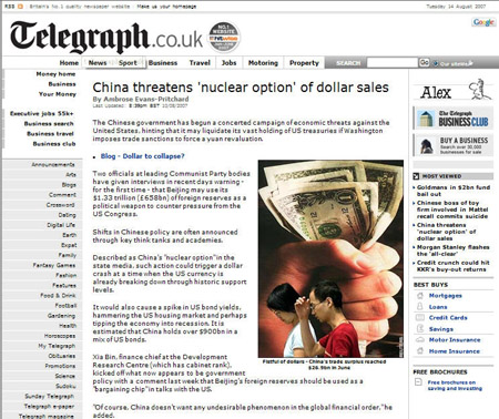普里查德就這樣“將兩條被單獨(dú)報(bào)道的引述連接到了一起”,同時(shí)加了“一個(gè)有力的注釋”。這樣“加工”出來的文章,8月8日出現(xiàn)在《每日電訊報(bào)》網(wǎng)站上。編輯為文章配的圖片顯然“獨(dú)具匠心”:一只黃皮膚的手緊緊攥著美元,“中國(guó)威脅美元”的暗示充斥其間,意味深長(zhǎng)。