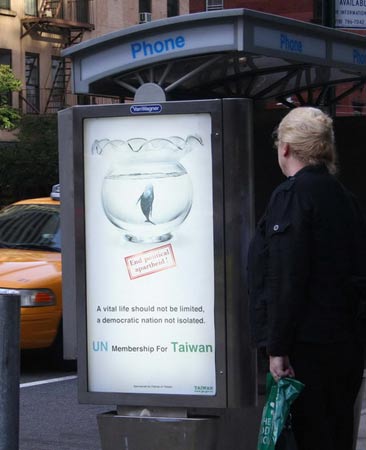 據臺灣“中央社”報道,臺灣今年首批“入聯”廣告27日傍晚在曼哈坦聯合國總部周邊電話亭掛了起來,從南到北、從西到東,總計二十幅。