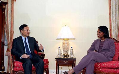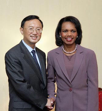 外交部長(zhǎng)楊潔篪在美國(guó)紐約華爾道夫飯店會(huì)見美國(guó)國(guó)務(wù)卿賴斯。新華社記者侯俊攝
