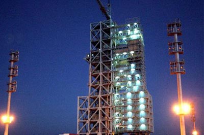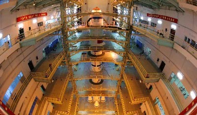 這是載人航天發射場運載火箭和“神舟”飛船垂直測試廠房內景。神舟六號載人飛船將用長征二號F型火箭進行發射。