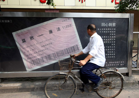 反腐海報走上街頭,市民從一張?zhí)厥獾幕疖嚻鼻敖?jīng)過,該車票從“腐敗站”始發(fā),終點站為“廉潔”。