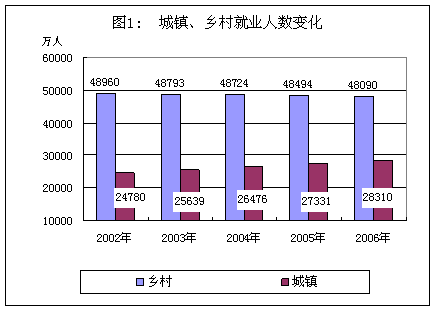 我國城鄉就業人員從2002年的73740萬人增加到2006年的76400萬人,增加了2660萬人,年均增加665萬人。其中:城鎮就業人員從24780萬人增加到28310萬人,年均增加883萬人;鄉村就業人員從48960萬人減少到48090萬人,年均減少218萬人。隨著城市化和工業化進程的加快,城鎮吸納就業的能力不斷增強,城鎮就業增長持續高于全國,其就業人員占全國的比重從2002年的33.6%上升到2006年的37.1%。城鎮就業崗位的快速增加,帶動了鄉村富余勞動力不斷向城鎮轉移,使鄉村就業人員占全國就業總量的比重從2002年的66.4%下降到2006年的62.9%(圖1)。