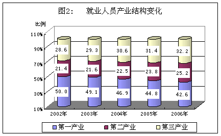 在就業總量持續穩定增加的同時,就業結構也得到了進一步優化。2006年全國第一產業就業人員32561萬人,比2002年減少4309萬人,下降11.7%,年均減少1077萬人;第二產業19225萬人,比2002年增加了3445萬人,增長21.8%,年均增加861萬人;第三產業24614萬人,比2002年增加了3524萬人,增長16.7%,年均增加881萬人。我國第一、第二和第三產業就業人員的比重由2002年的50.0:21.4:28.6轉變為2006年的42.6:25.2:32.2(圖2)。