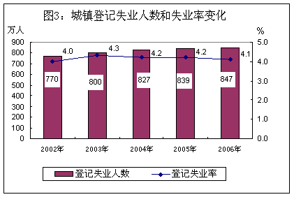 在努力擴大就業的同時,政府采取多種措施加強了失業調控。隨著我國經濟的快速增長和各項擴大就業政策的逐步落實,2002-2006年城鎮登記失業率均保持在4.0%-4.3%的較低水平(圖3)。在勞動力總量矛盾和結構性矛盾突出的情況下,失業率得到有效控制,保持了就業局勢的基本穩定,為創建和諧穩定的社會環境,推動經濟社會持續穩定健康發展發揮了重要作用。