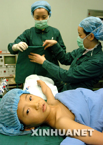 這是2006年11月14日,患有先天性心臟病室間隔缺損的6歲患兒蔣夢涵,在江蘇省淮安市第二人民醫院胸外科接受手術。淮安市第二人民醫院啟動“愛心助醫工程”,為淮安市特困家庭、低保戶家庭中患有先天性心臟病的兒童免費實施手術。