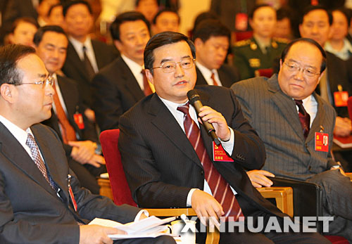 10月16日,中共十七大代表、國防科工委主任張慶偉說,舉世矚目的繞月工程總體準備情況良好,正在進行10月下旬首飛發射前的各項準備工作。這是張慶偉(前中)就繞月工程回答記者提問。新華社記者 黃敬文 攝