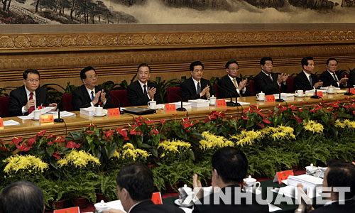 10月17日,中國共產黨第十七次全國代表大會主席團在北京人民大會堂舉行第二次會議。胡錦濤、吳邦國、溫家寶、賈慶林、曾慶紅、吳官正、李長春、羅干等出席會議。新華社記者蘭紅光攝