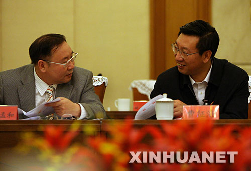 代表瞬間:會前討論。這是內蒙古自治區分團討論會開始前,曹征海代表(右)與那順孟和代表抓緊時間討論。新華社記者劉衛兵攝