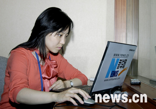 圖為新華網前方報道人員在十七大新聞中心緊張工作。(新華網 榮忠霞/攝)