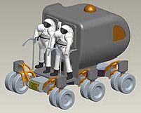 NASA還在考慮采用小型增壓漫游車,而這可能是在月球上有效地開展工作的關鍵之舉。根據工程技術人員的設想,這些漫游車將成對出行,每輛車上乘兩名宇航員。漫游車可行駛到距前哨基地將近200公里的地方,開展科學探測或其它活動。若其中一輛漫游車出現機械問題,宇航員可改乘另一輛漫游車返回基地。