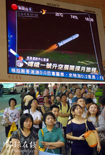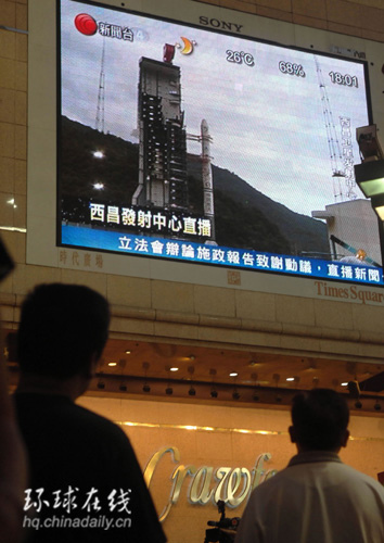 10月24日,香港市民在時代廣場觀看搭載著我國首顆探月衛星嫦娥一號的長征三號甲運載火箭發射的電視直播。