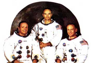 “阿波羅11號(hào)”登月行動(dòng)中的三名宇航員,左:阿姆斯特朗;中:科林斯;右:奧爾德林。其中,阿姆斯特朗成為人類登月第一人。