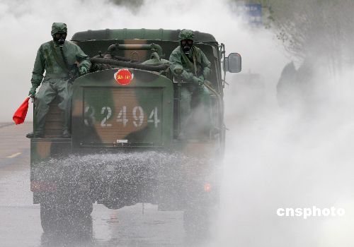 部隊機動途中道路消毒。10月28日,鐵拳-2007機步師實兵檢驗性演習部隊在機動途中展開防持久毒劑襲擊,化學偵察,道路消毒,裝備消毒,人員消毒等科目演練。中新社發曾憲平 攝