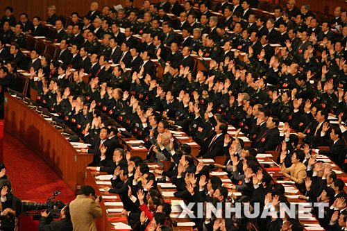10月21日,中國共產黨第十七次全國代表大會在北京人民大會堂勝利閉幕。這是代表們舉手表決。