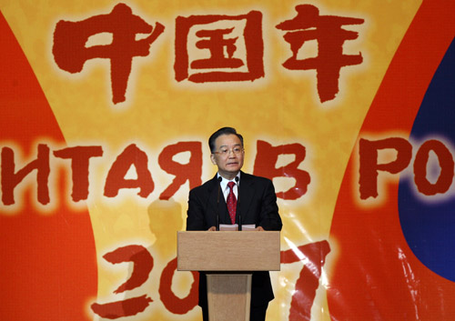 11月6日晚,“中國年”閉幕式在莫斯科克里姆林宮大禮堂隆重舉行。中國國務(wù)院總理溫家寶和俄羅斯總理祖布科夫共同出席。這是溫家寶在閉幕式上致辭。新華社記者黃敬文攝