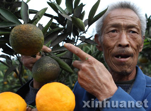 10月30日,后灣村果農李鴻昌老人向記者展示被污染的柑橘與正常柑橘的差異。金秋時節本應是地處秦嶺南麓的陜西省城固縣桔園鎮柑橘豐收的季節。然而,該鎮后灣村的果農卻愁眉苦臉,他們的橘園因受到鄰近一家化工廠排出的鉻灰嚴重污染,橘葉被一層厚厚的黑灰所覆蓋,本該黃里透紅的柑橘被污染成“黑橘”,無人問津,農民損失慘重。城固縣是我國優質柑橘生產基地,把發展無公害柑橘作為富民興縣的第一大產業。據了解,桔園鎮有橘園3萬多畝,受這家化工廠污染的橘園有近千畝,嚴重污染的近200畝。這家化工廠專門用于排放鉻灰的煙囪是今年4月建成的,每當排煙時,附近的橘園和村莊便煙塵飛揚,幾十米外的物體都看不到。排出的大量污水,更是刺鼻難聞,對周邊的環境和村民生活造成嚴重影響,農民叫苦不迭。新華社記者 格桑達瓦 攝