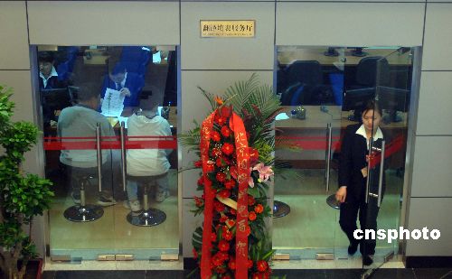 4月11日,北京赴美簽證服務(wù)大廳新址在朝陽區(qū)建外街秀水大廈西側(cè)落成并正式對外開放,服務(wù)大廳設(shè)立候簽、咨詢、照相、翻譯、復(fù)印、銀行等綜合服務(wù)項目,并為特殊需要的人員準備了VIP包間服務(wù)。圖為翻譯服務(wù)大廳。