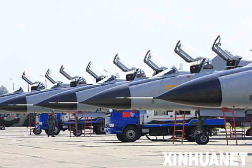 8月3日,參加“和平使命-2007”聯(lián)合反恐軍演的中國(guó)新型殲擊轟炸機(jī)停在俄羅斯車?yán)镅刨e斯克州的沙戈?duì)枡C(jī)場(chǎng)。參加這次演習(xí)的殲轟飛機(jī)是中國(guó)自行研制生產(chǎn)、具有自主知識(shí)產(chǎn)權(quán)的殲擊轟炸機(jī),被譽(yù)為中國(guó)“飛豹”。這是中國(guó)空軍國(guó)產(chǎn)新型裝備第一次飛出國(guó)門參加實(shí)兵演習(xí)。新華社記者 李剛 攝