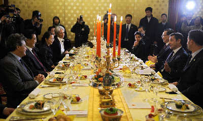 中國國家主席胡錦濤昨晚(11月25日)在釣魚臺國賓館特意以法式大餐招待來訪的法國總統薩科齊,賓主雙方相談甚歡。與正式會談時雙方領導人和各自官員分坐同一邊的嚴肅不同,昨天的宴會氣氛很輕松,雙方代表混坐在一起,胡錦濤的右側就是法國環境部長路易斯·波盧,而薩科齊的右側則坐著中國國務委員唐家璇。