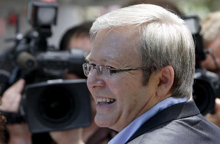 澳大利亞工黨領導人陸克文投票后微笑面對媒體。新華社記者 張軍攝